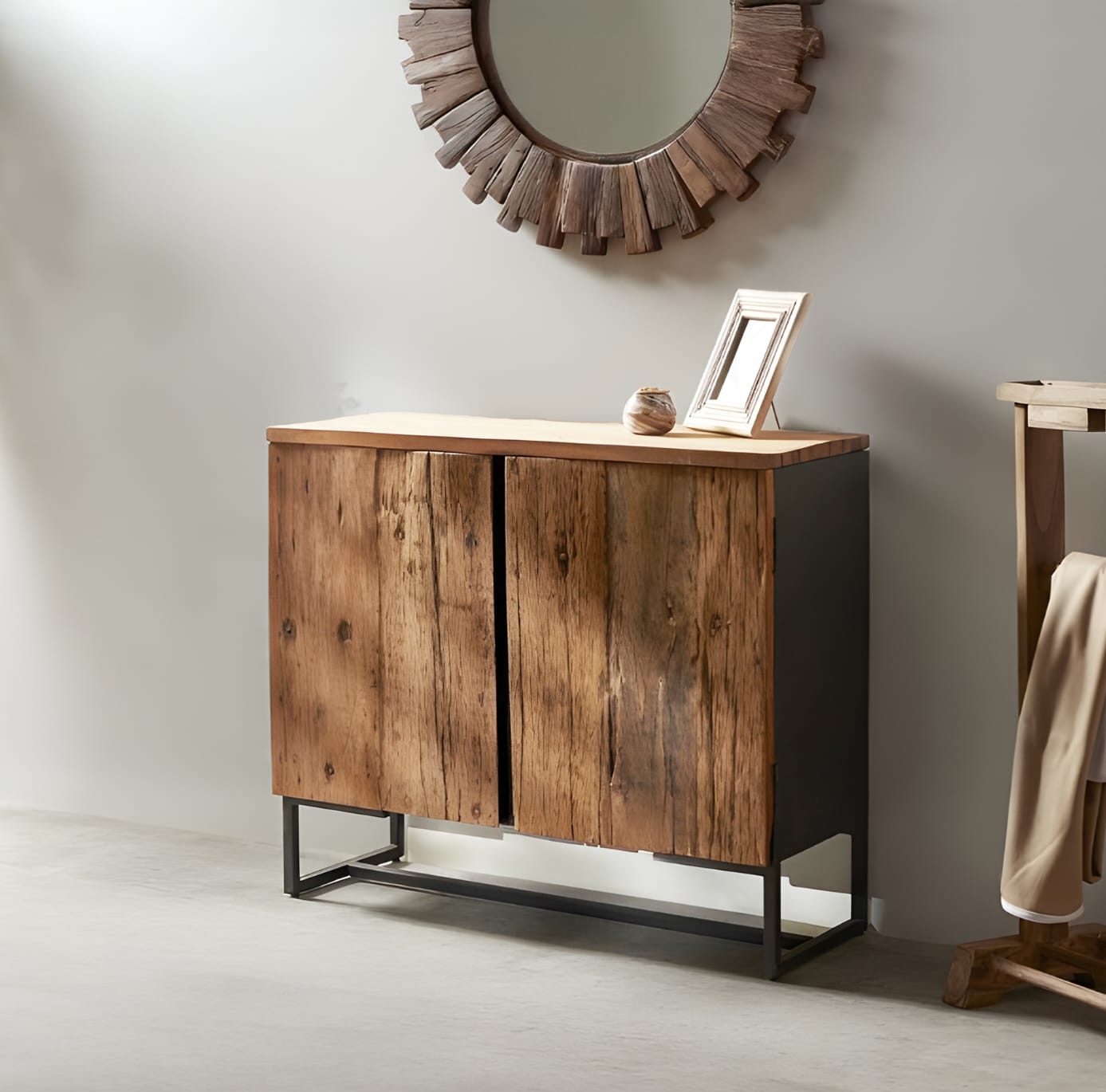 שידה מרשימה המשלבת עיצוב כפרי-תעשייתי עם קווים מודרניים ונקיים. החזיתות עשויות עץ בגימור טבעי עם טקסטורה מחוספסת ומלאת אופי, והבסיס מתכת שחורה היוצר ניגוד אלגנטי ויציבות מרבית.