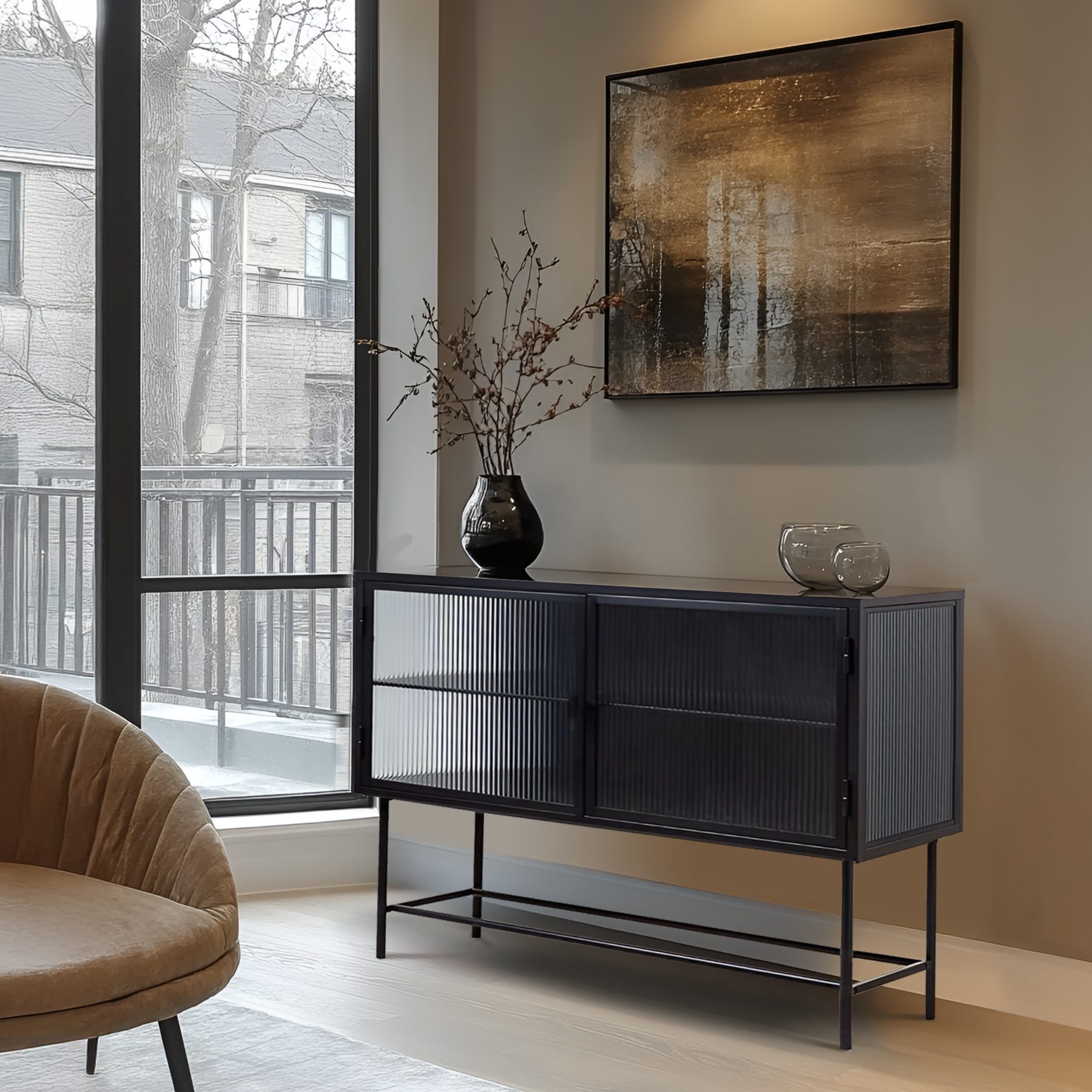 ויטרינה מעוצבת ממתכת שחורה עם דלתות זכוכית מחוספסות. אידיאלית לאחסון ספרים, כלי נוי או כלי זכוכית, עם עיצוב מודרני ונקי שמוסיף יוקרה לכל חלל. מידות: 140×40×100 ס"מ (גובה)