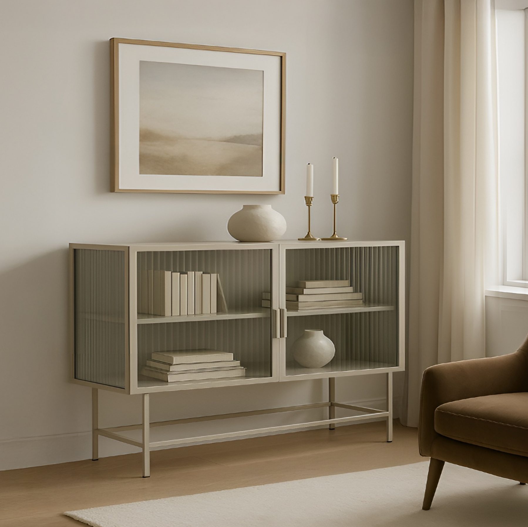 ויטרינה מעוצבת בגוון שמנת בהיר עם דלתות זכוכית מחוספסות. שילוב של קלאסיות ורעננות, מתאימה במיוחד לחללים מוארים. מידות: 100×40×140 ס"מ (גובה)