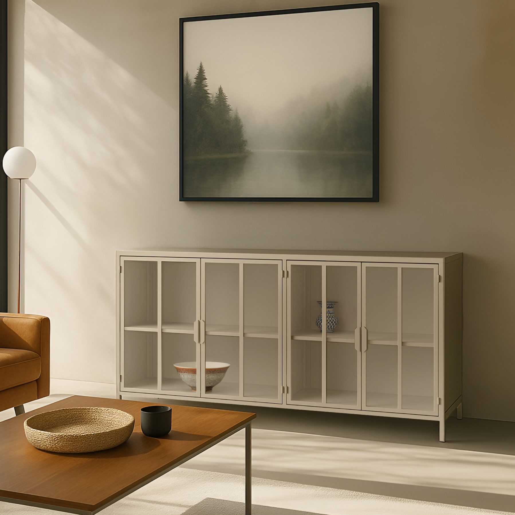ויטרינה רחבה ומרשימה בגוון שמנת, עם דלתות זכוכית שקופות. מעניקה תחושה של קלילות ושפע אחסון בעיצוב מודרני. מידות: 150×40.5×90 ס"מ