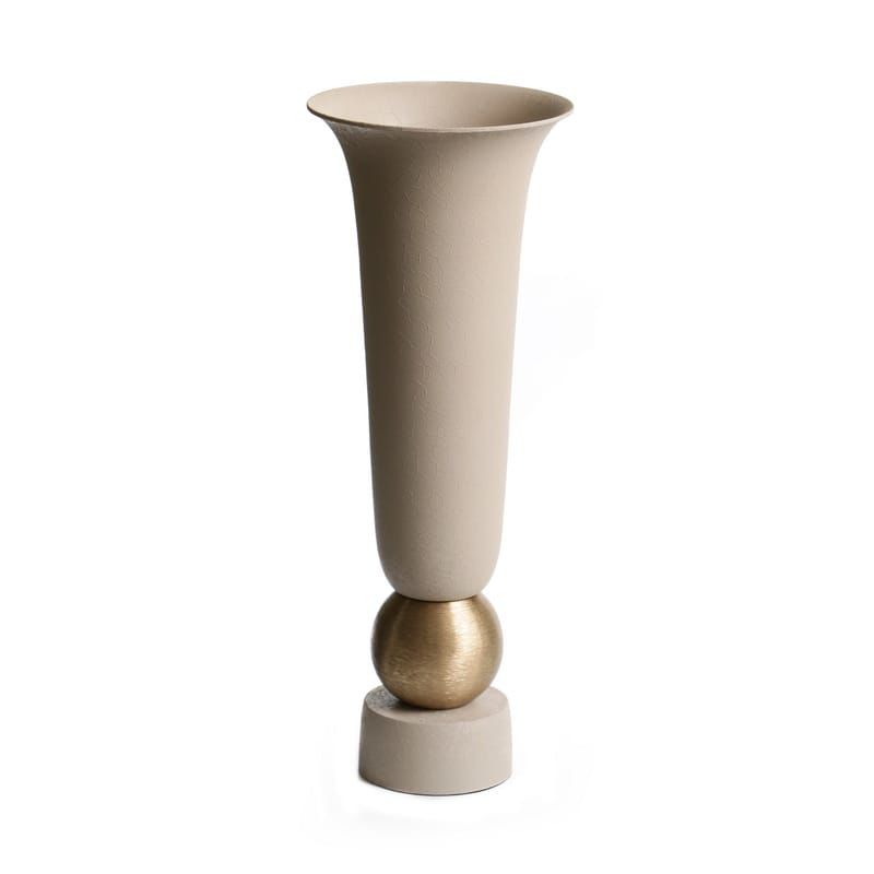 הכד עשוי חומר איכותי במרקם מט בגוון בז׳ טבעי, ומשולב עם אלמנט כדורי מוזהב בבסיסו המוסיף עומק ואלגנטיות.