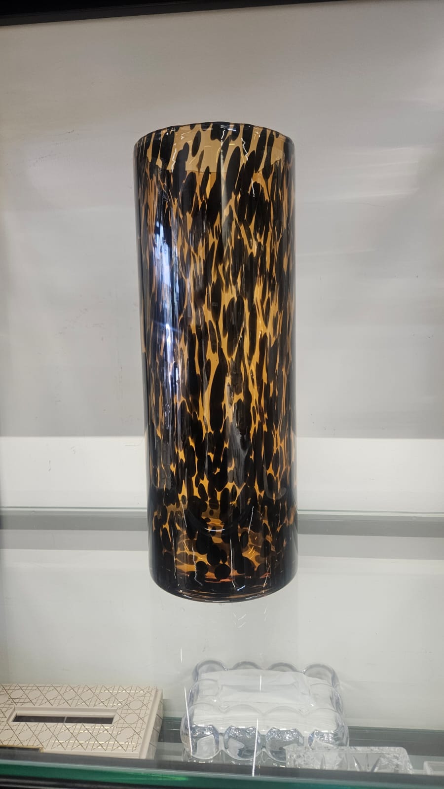 כד זכוכית בגימור מנומר מרהיב, בעיצוב גלילי קלאסי ופתח רחב – מושלם לסידור פרחים גבוהים או כאלמנט עיצובי בפני עצמו על מדף, שידה או שולחן.
