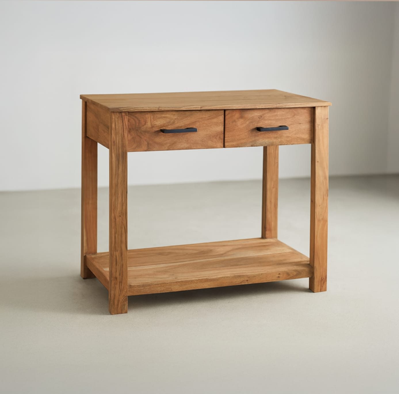 קונסולה מקסימה בעיצוב כפרי טבעי, עשויה עץ מלא בגוון חם עם טקסטורה עשירה.
