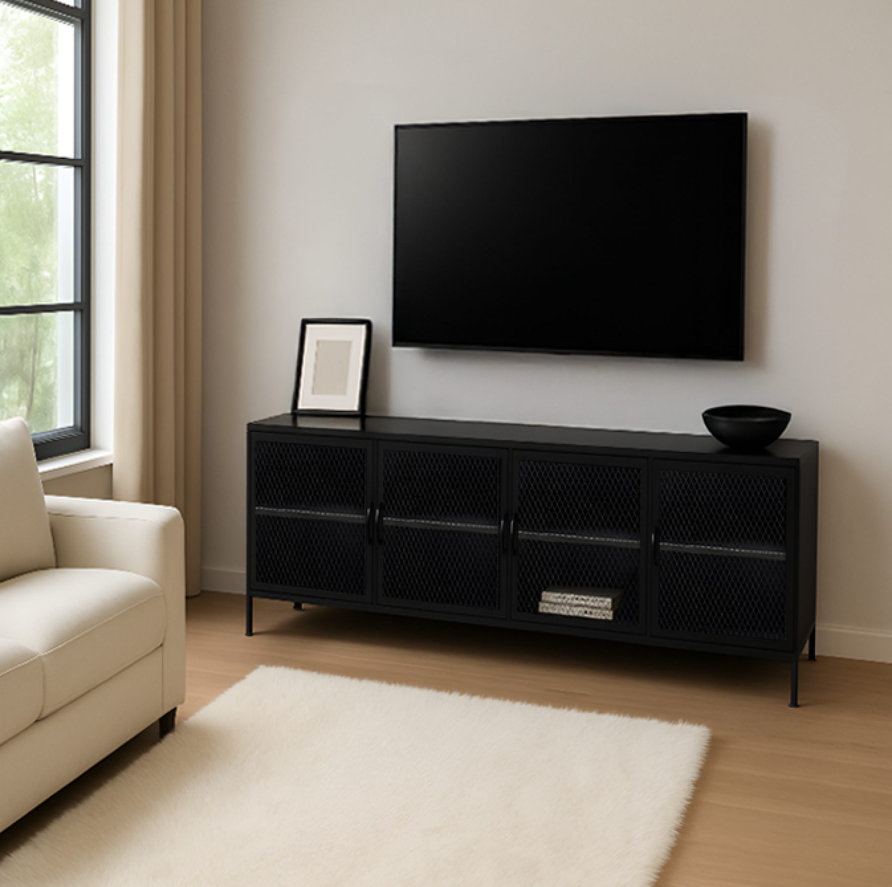 מזנון טלוויזיה מעוצב מברזל שחור עם דלתות רשת מתכת. מראה תעשייתי מודרני עם מקום אחסון רב. מידות: 160×40×50 ס"מ