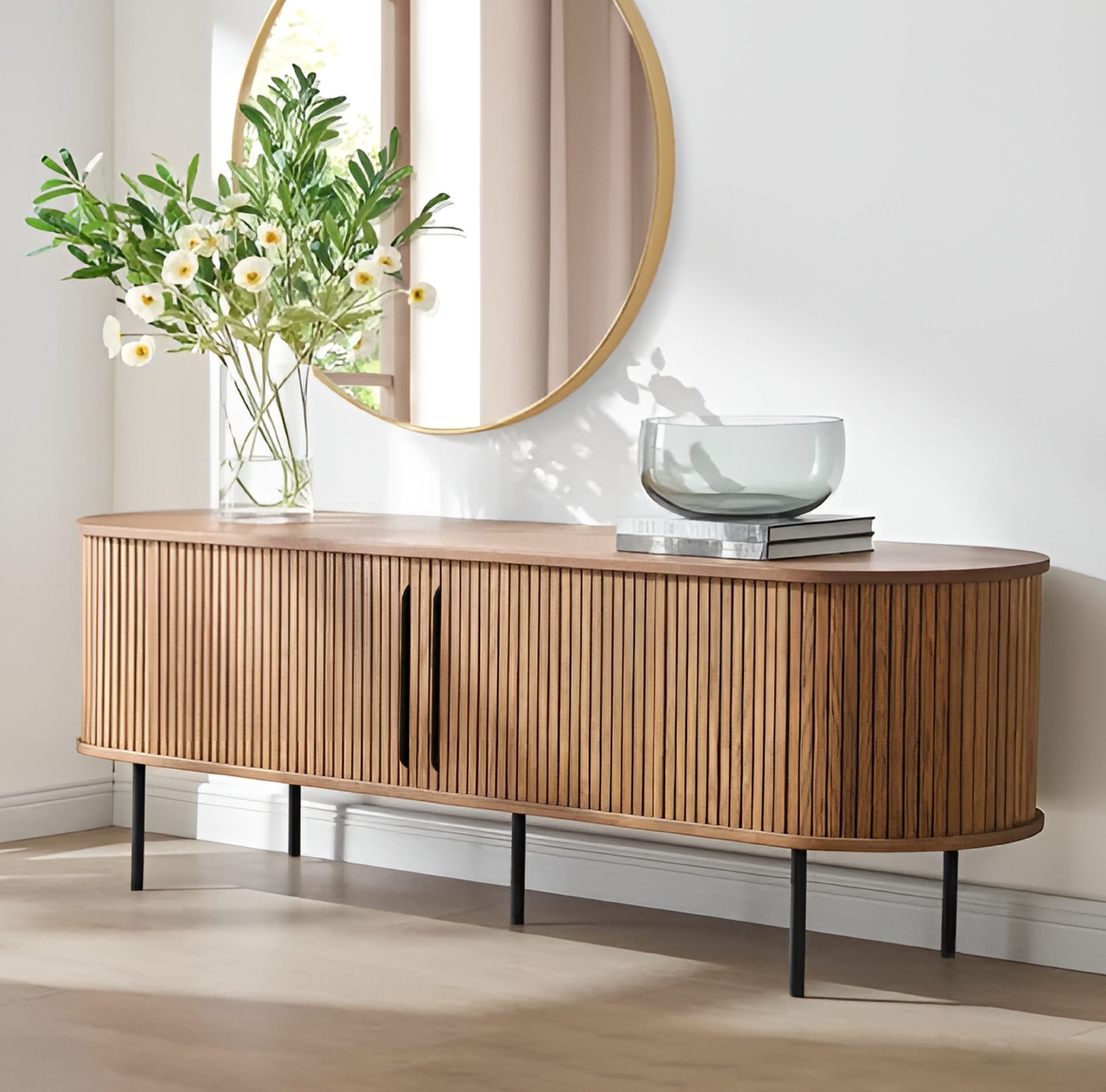 מזנון טלוויזיה רחב בעיצוב אלגנטי, עשוי עץ מלא בגוון טבעי עם חזית חרוטה ורגלי מתכת שחורות. מתאים למסכי טלוויזיה גדולים.