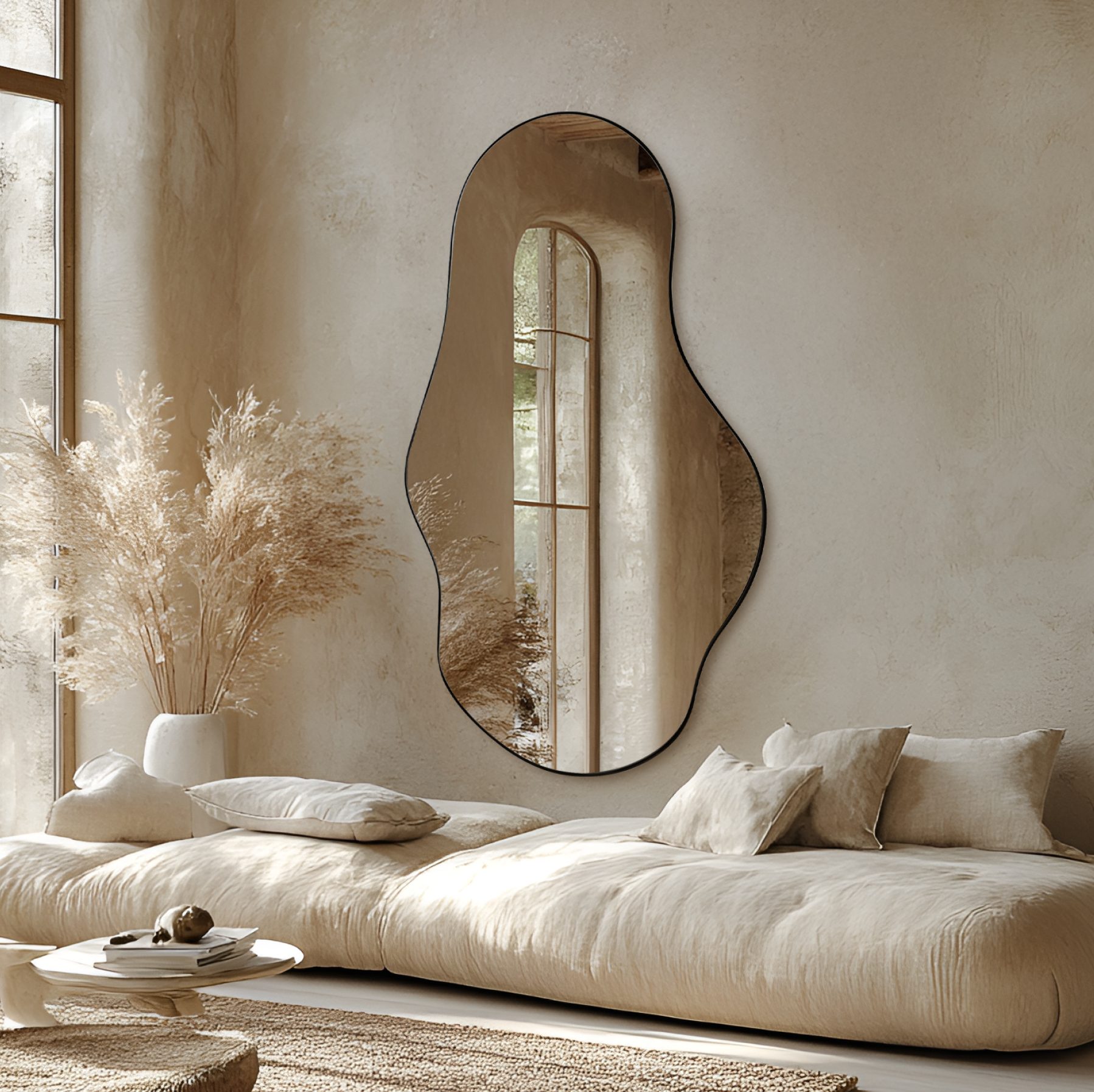 מראה אמורפית בצורת אגם, מסגרת שחורה, גודל 90/160 ס״מ.