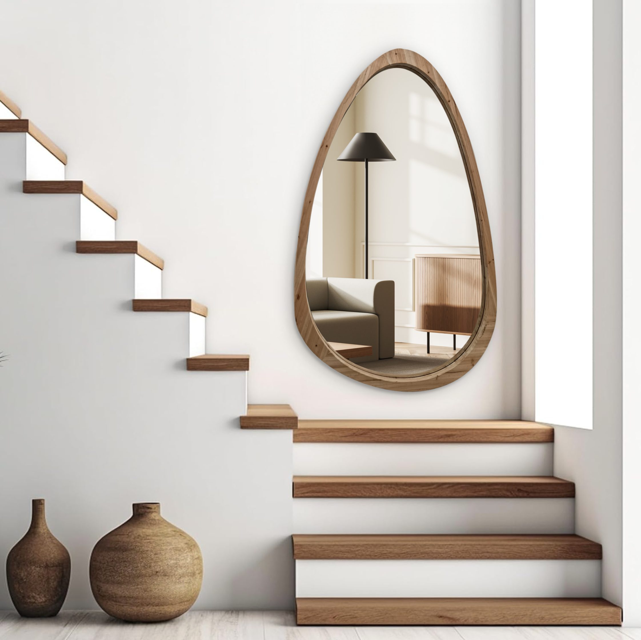 מראה בצורת ביצה אמורפית במסגרת עץ טבעי. מידות: 104/170 ס"מ.