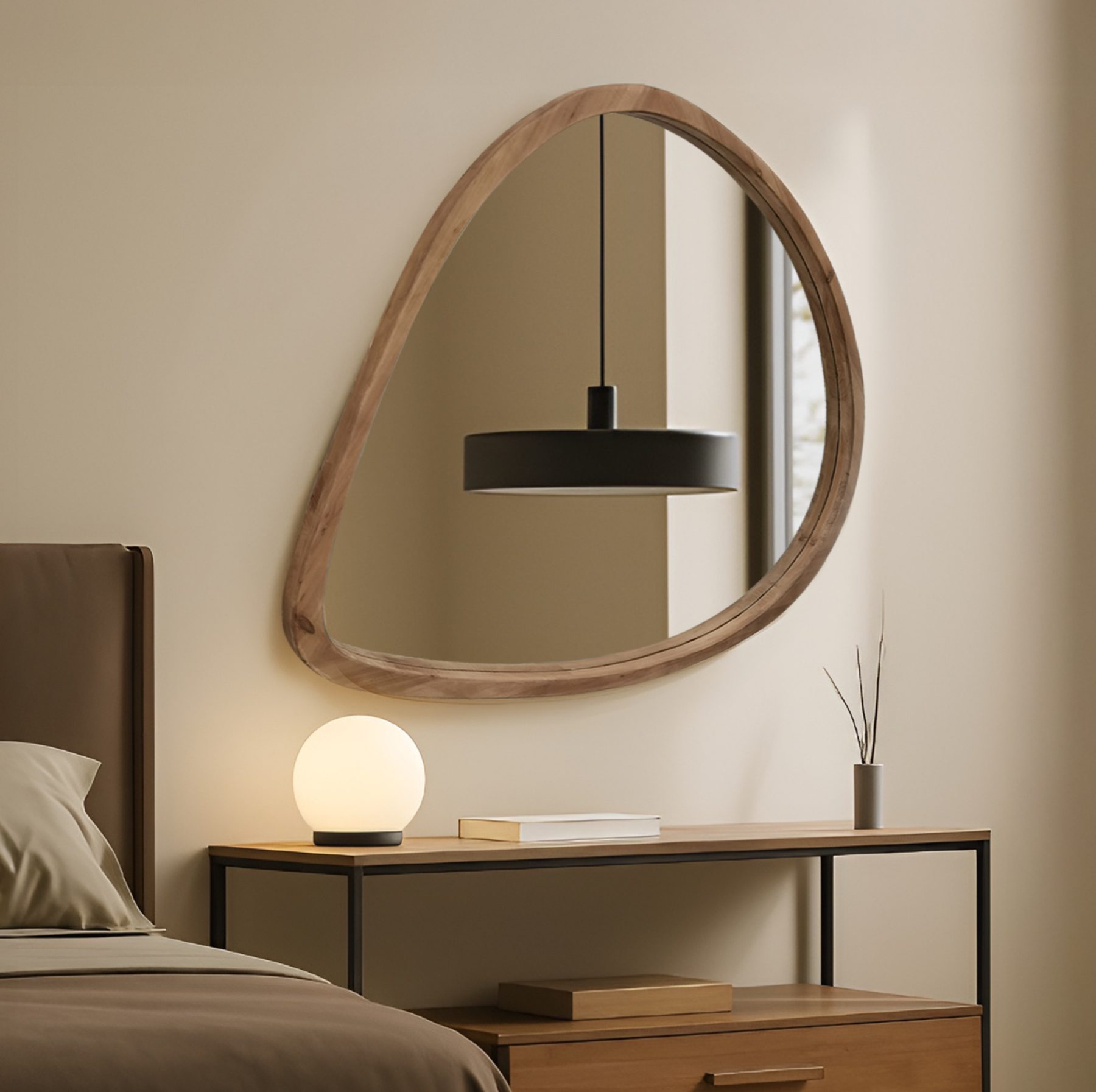 מראה אמורפית בעיצוב ייחודי עם מסגרת עץ טבעי. מידה: 100/115 ס״מ. חומר: עץ ומתכת.