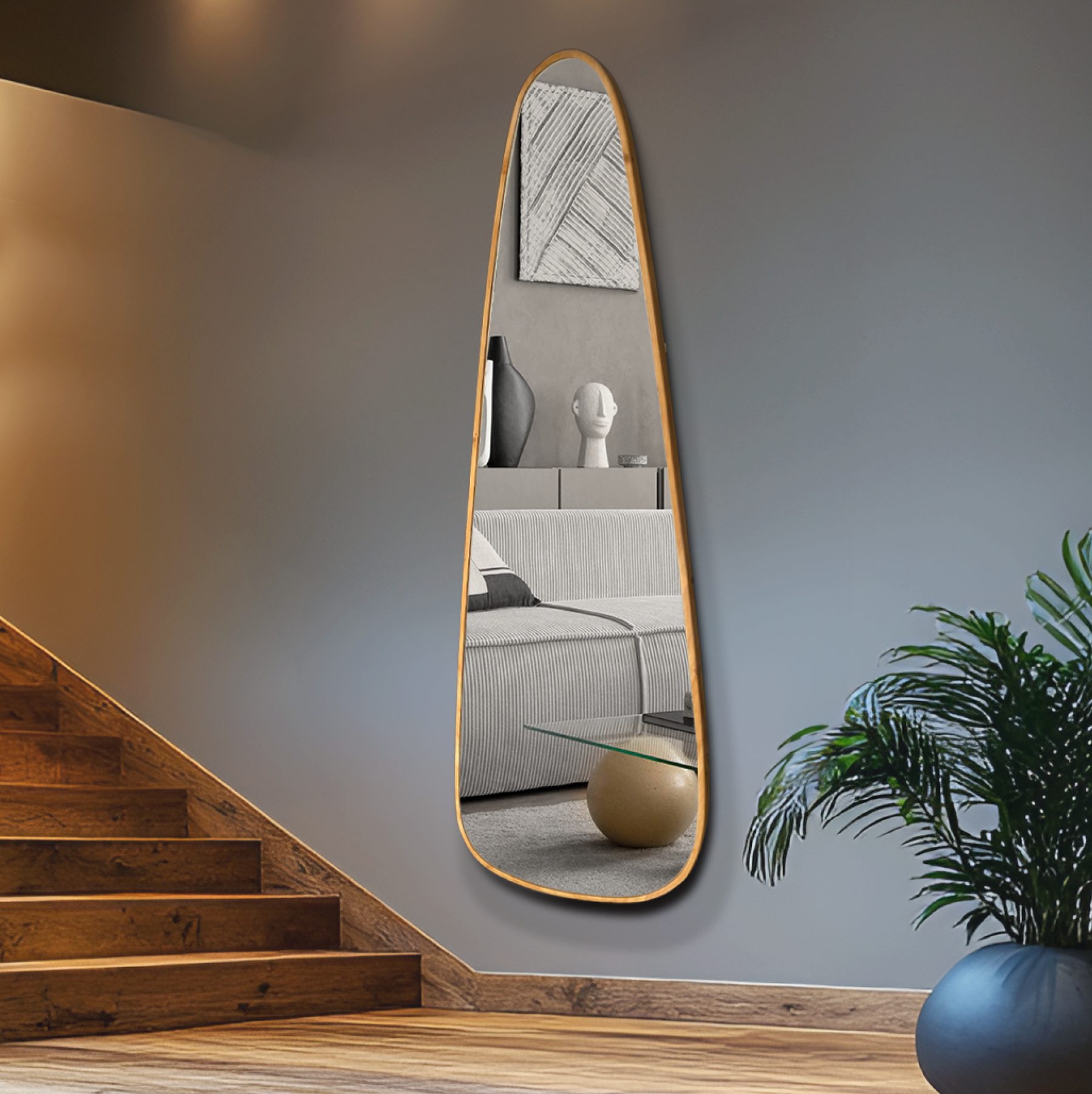 מראה בצורת טיפה עם גוף עץ טבעי. מידות: 58/160 ס"מ.