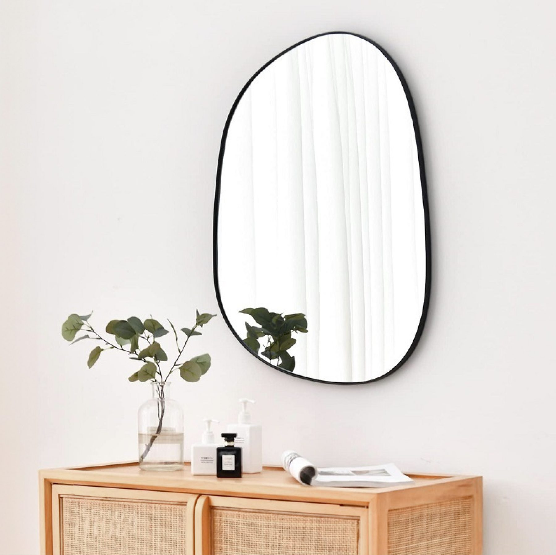 מראה טרפז מעוגל עם מסגרת שחורה מודרנית, מידות 55/88 ס"מ.