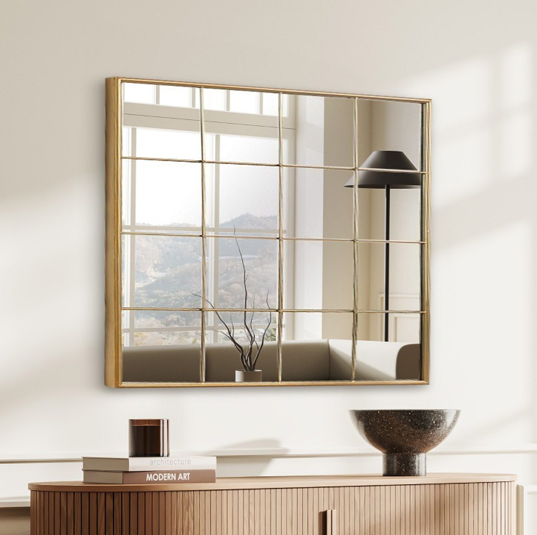 מראה מעוצבת עם חלוקת ריבועים, מסגרת זהב, גודל 75/100 ס״מ.
