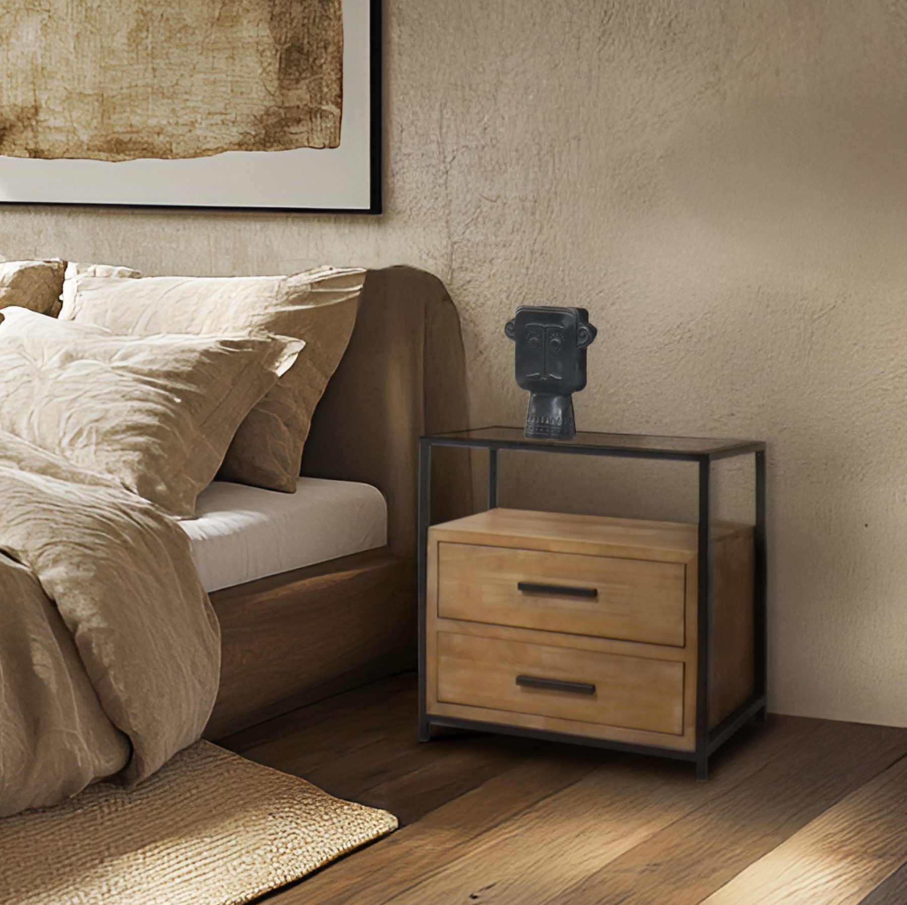 שידת עץ וברזל עם 2 מגירות, עיצוב תעשייתי מודרני. מידות: 50/30/60 ס"מ.