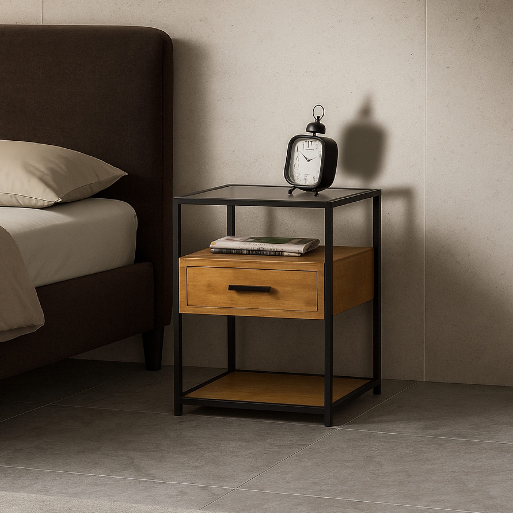 שידת עץ וברזל עם מגירה אחת, עיצוב מודרני. מידות: 50/30/60 ס"מ.