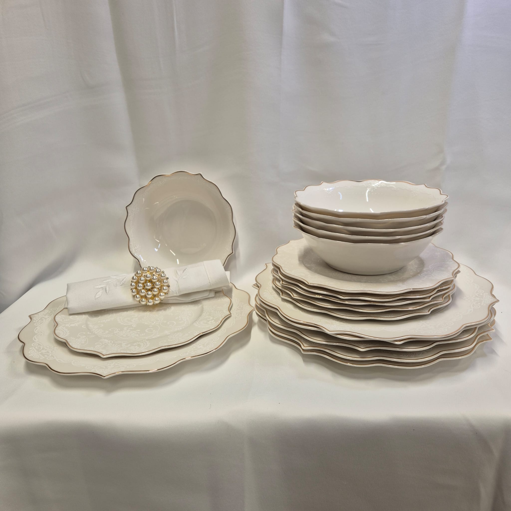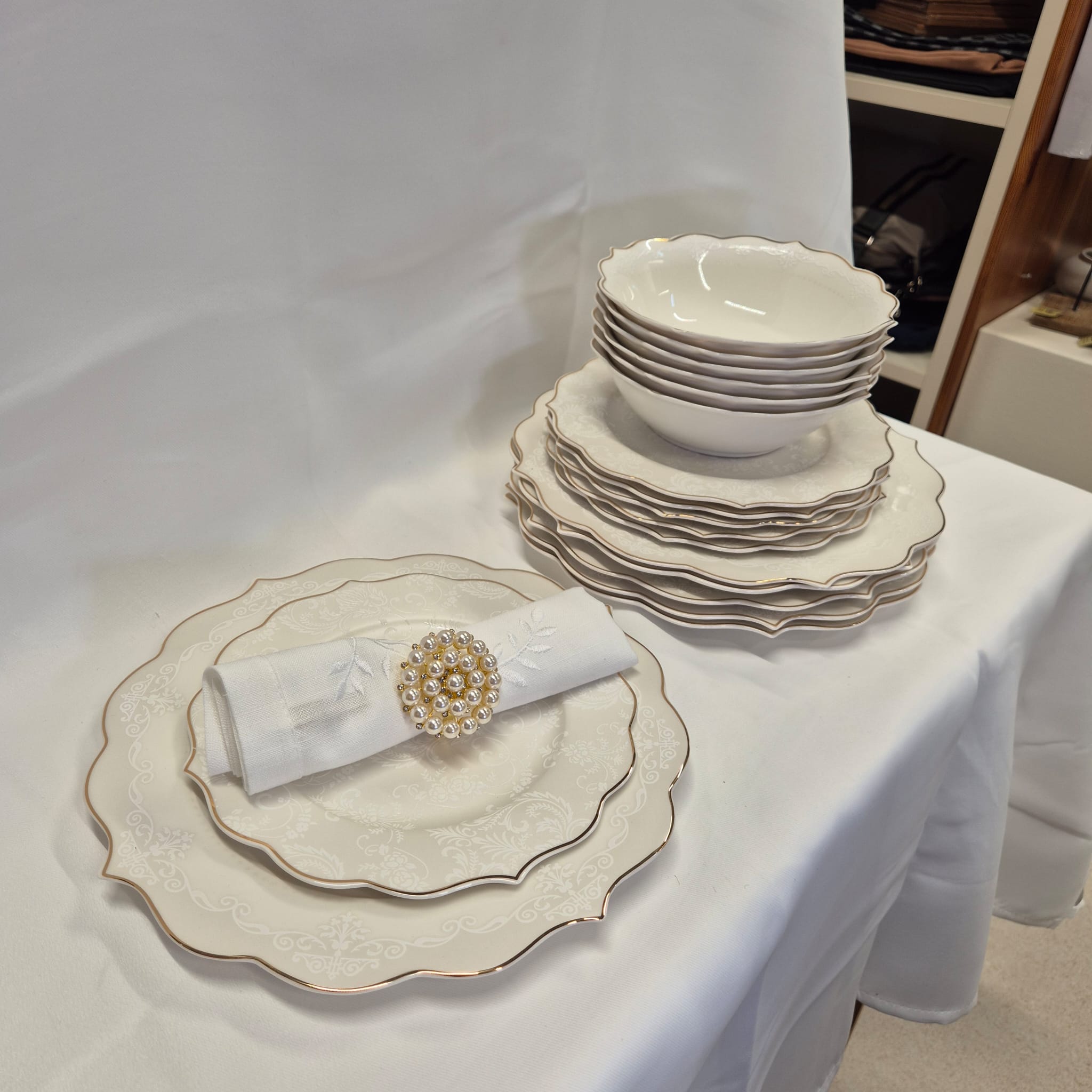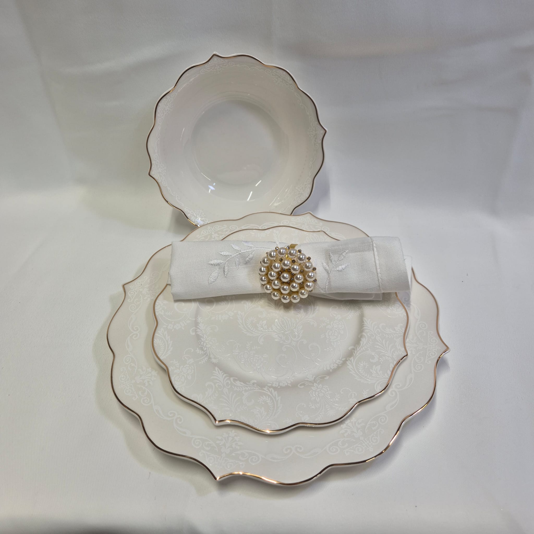 עיצוב איטלקי אלגנטי בשילוב פס זהב עדין והטבעה אומנותית שמעניקה תחושת פאר אמיתית. מושלם לאירוח שבתות, חגים או פשוט למי שאוהב שולחן שמספר סיפור של טעם טוב.