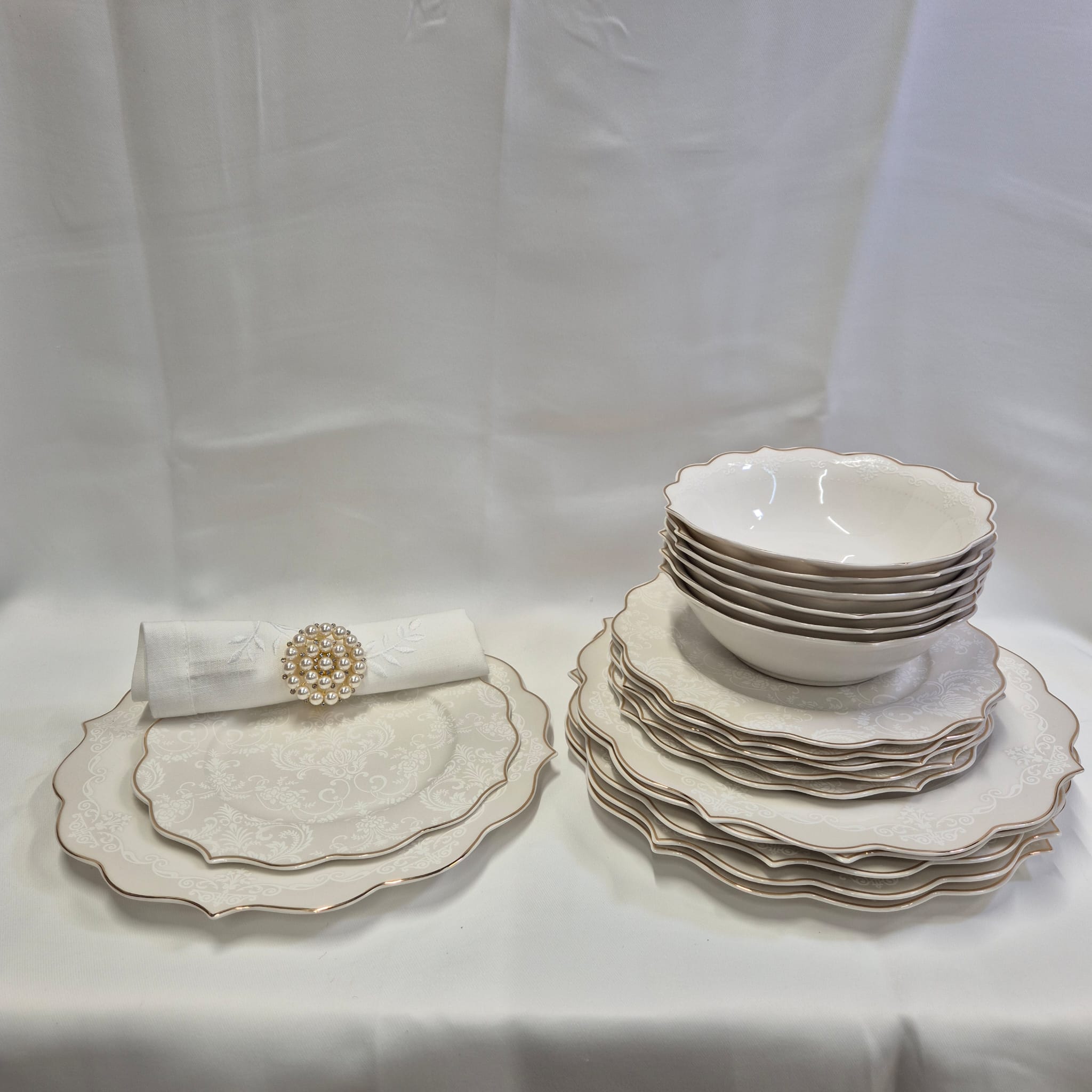 🟡 פורצלן איכותי, עמיד במדיח 🟡 קווים גליים שנותנים אפקט תלת־ממדי מרשים 🟡 כולל צלחות מנה ראשונה, עיקרית וקינוח 🟡 מגיע עם 18 חלקים באריזה חגיגית