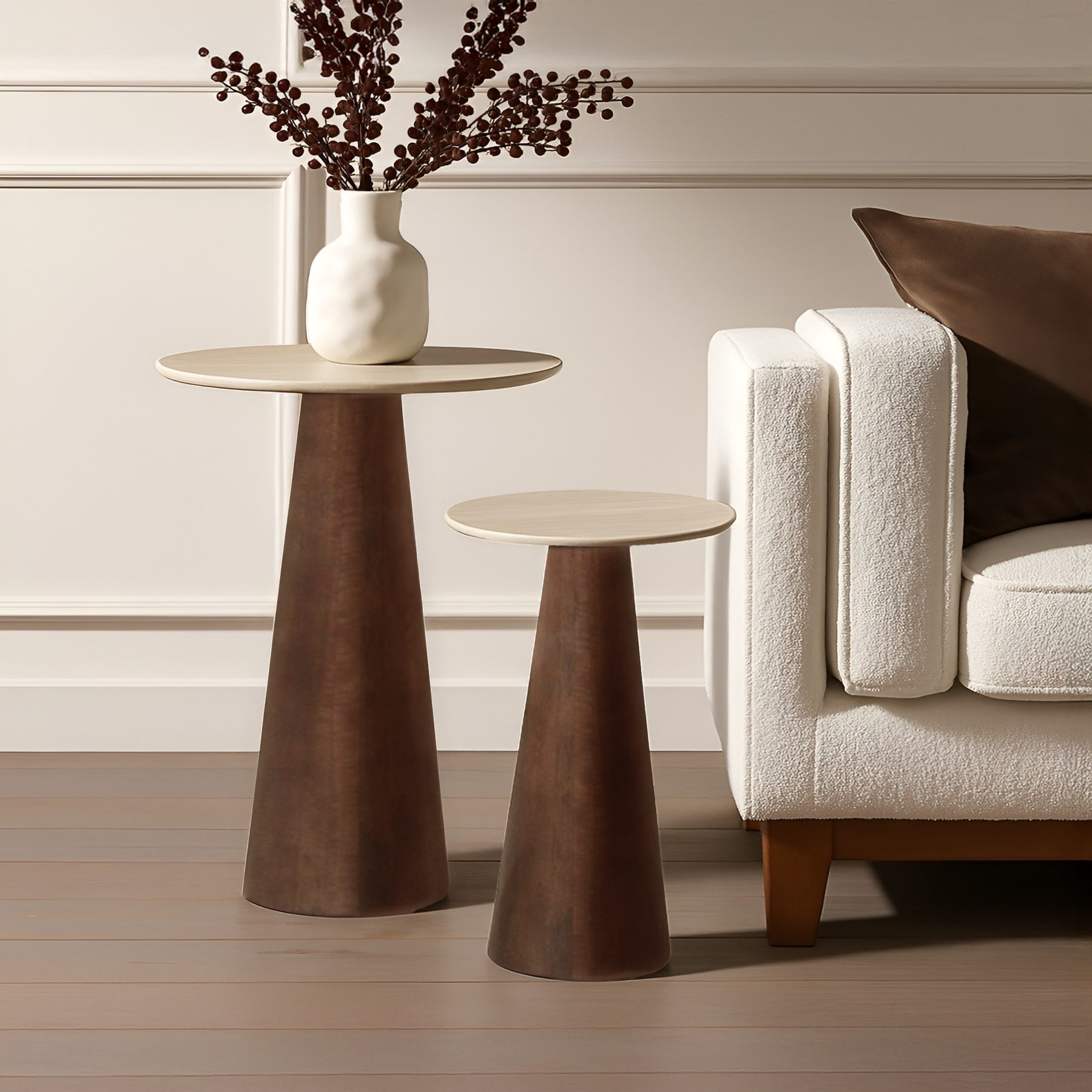 סט יוקרתי של שני סטנדים בעיצוב מינימליסטי. בסיס עץ מלא עם משטח אבן טרוורטין, אידיאלי להנחת פרחים, ספרים או חפצי נוי שמוסיפים טאצ' אלגנטי לחלל. מידות: – גדול: 40×40×73 ס"מ – קטן: 40×40×52 ס"מ