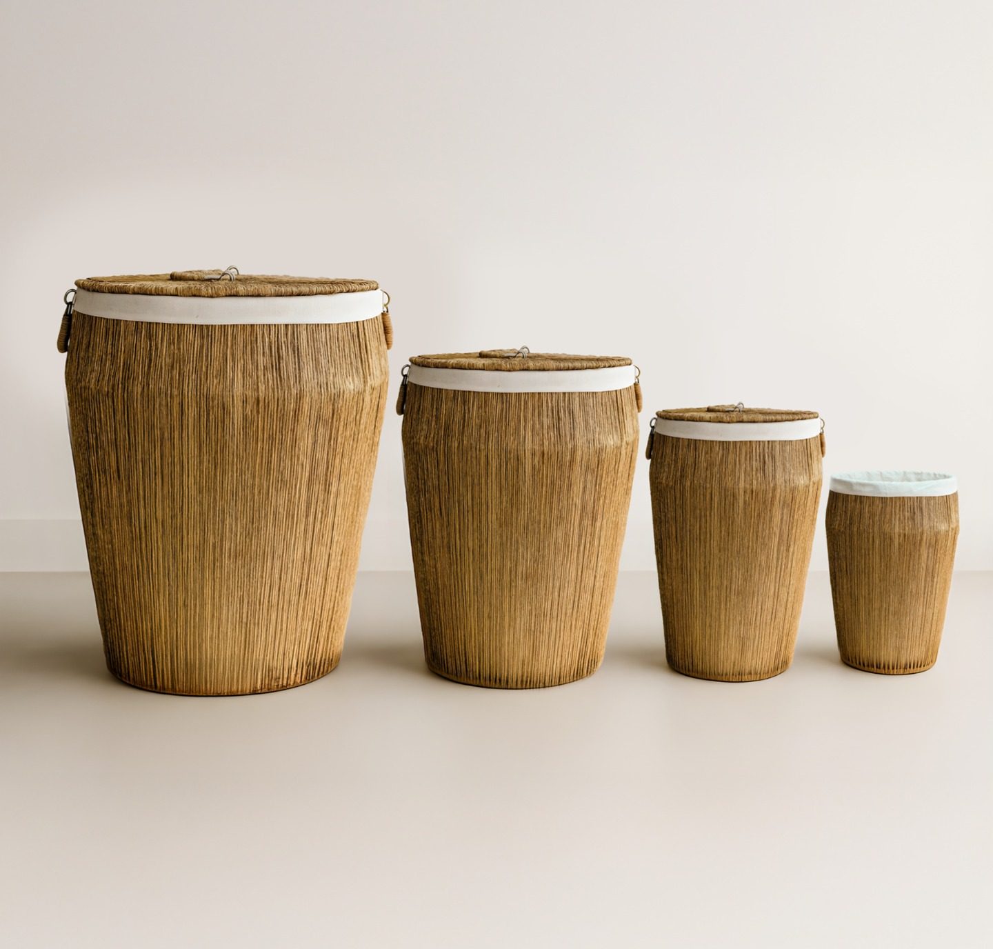 סט סלים עמידים מכוסי יוטה טבעית עם מכסה, המושלמים לכביסה, אחסון שמיכות או צעצועים. המראה הכפרי משתלב בכל חלל – חדר שינה, סלון או חדר רחצה.מידות: 21×28, 27×36, 33×43, 40×51 ס"מ