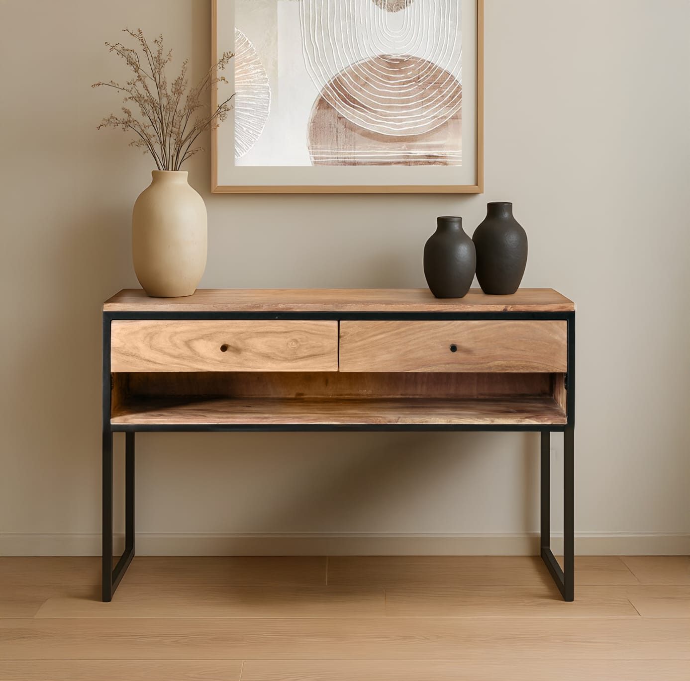 קונסולה מעוצבת בקווים נקיים ומשולבת עץ טבעי עם מסגרת מתכת שחורה – שילוב מושלם של חמימות וטאץ’ תעשייתי עדין.