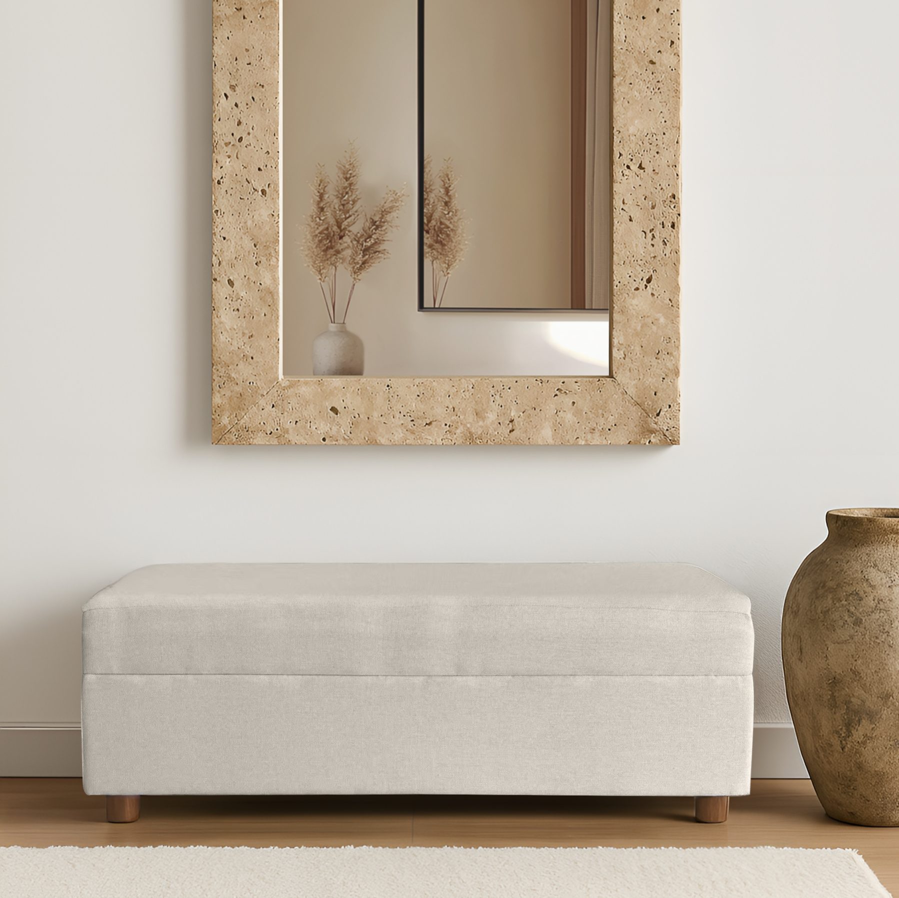 ספסל מלבני מרופד בבד קנבס בצבע טבעי עם רגלי עץ מלא. מידות: 120/40/40 ס"מ