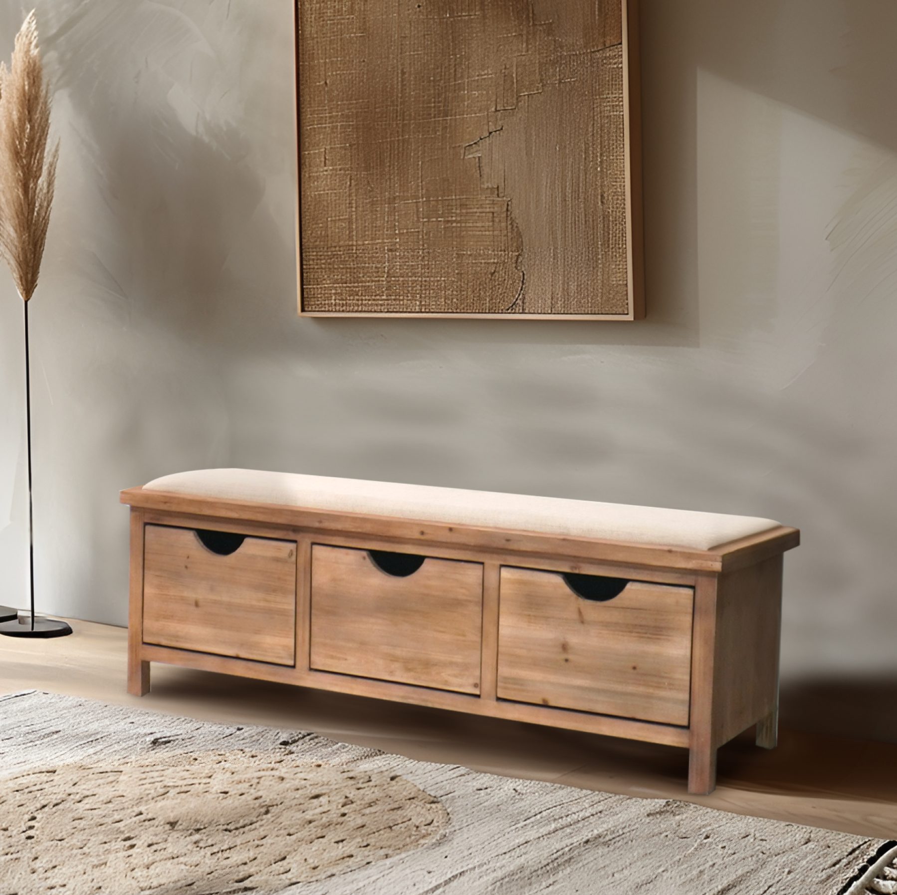 ספסל מעץ מלא עם מושב מרופד ו-3 מגירות אחסון שימושיות. מידות: 120/38/43 ס"מ
