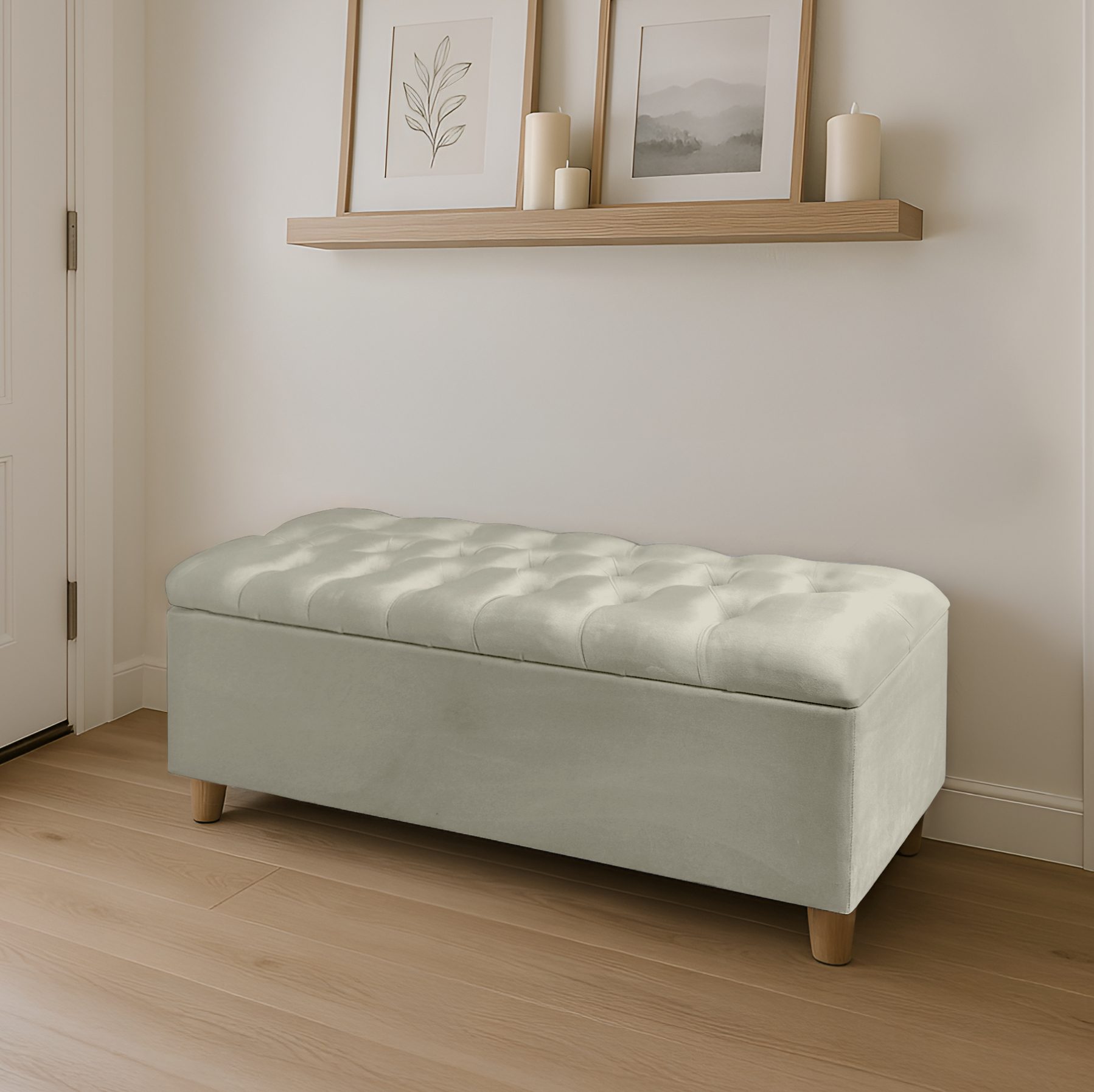 ספסל מרופד בקטיפה בצבע בז' עם קפיטונז' קלאסי, רגלי עץ טבעי. מידות: 120/40/40 ס"מ