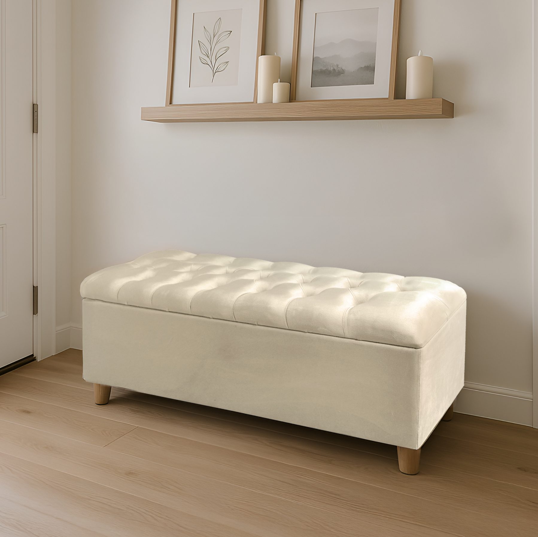 ספסל מרופד בקטיפה בצבע שמנת עם קפיטונז' אלגנטי, רגלי עץ טבעי. מידות: 120/40/40 ס"מ