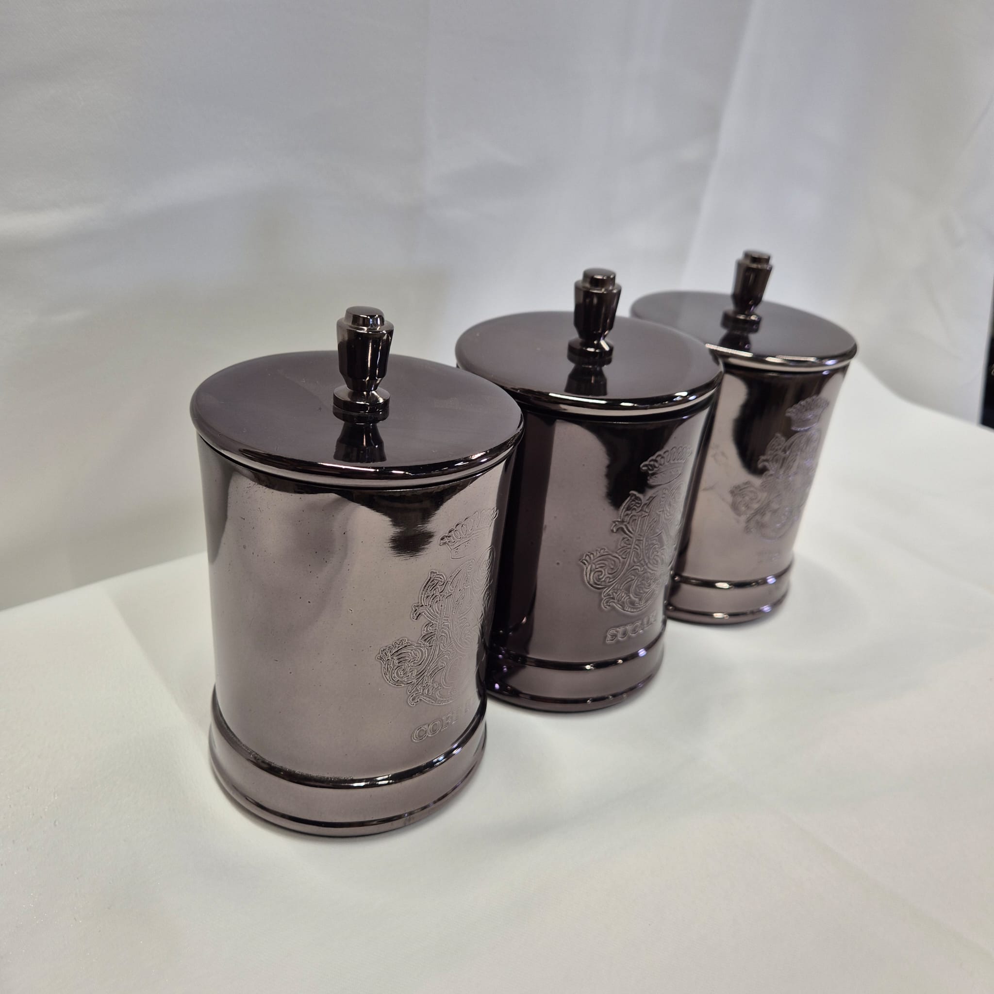 שלישיית קופסאות דקורטיביות ממתכת איכותית בגימור מתכתי מבריק – בצבע שמפניה או שחור מוברש – עם חריטת סמל קלאסי.