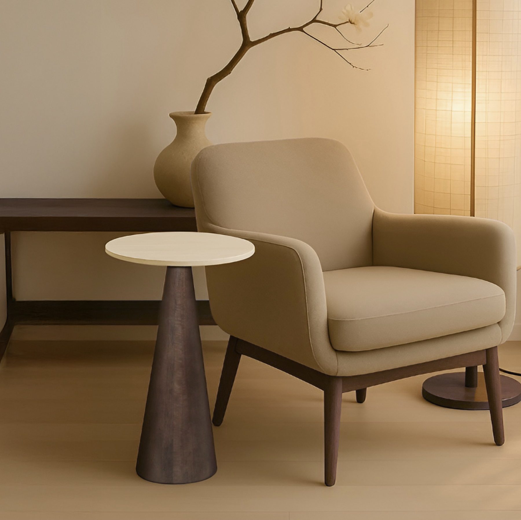 שולחן צד קומפקטי עם בסיס עץ מלא ומשטח אבן טרוורטין טבעית. מתאים ליד כורסה, מיטה או כפינת קפה מעוצבת. מידות: 50×50×50 ס"מ